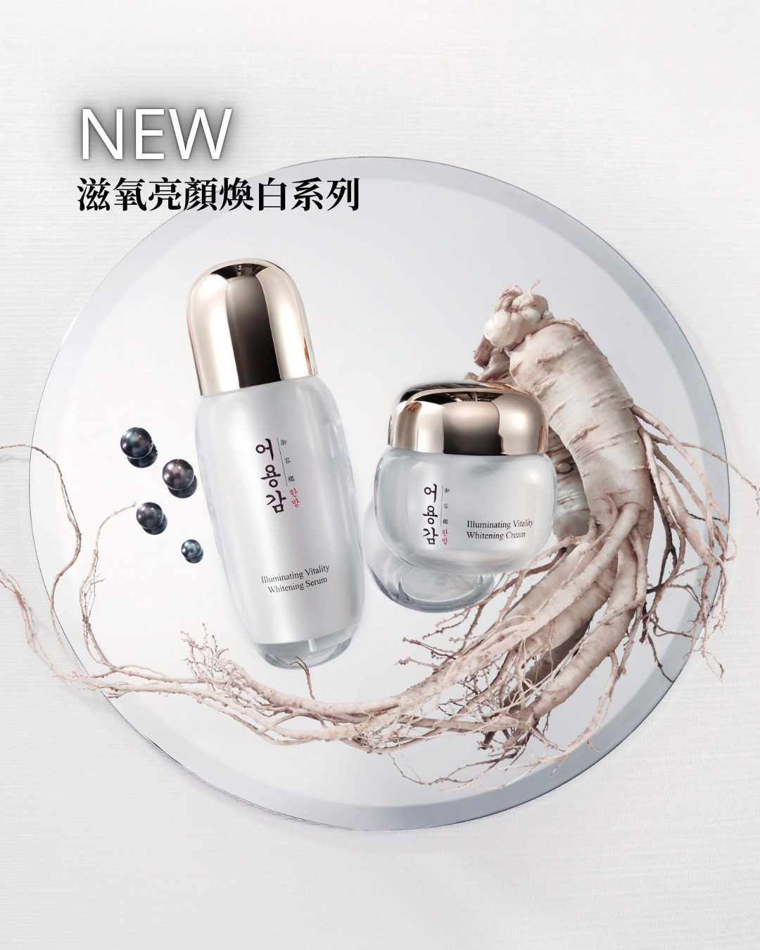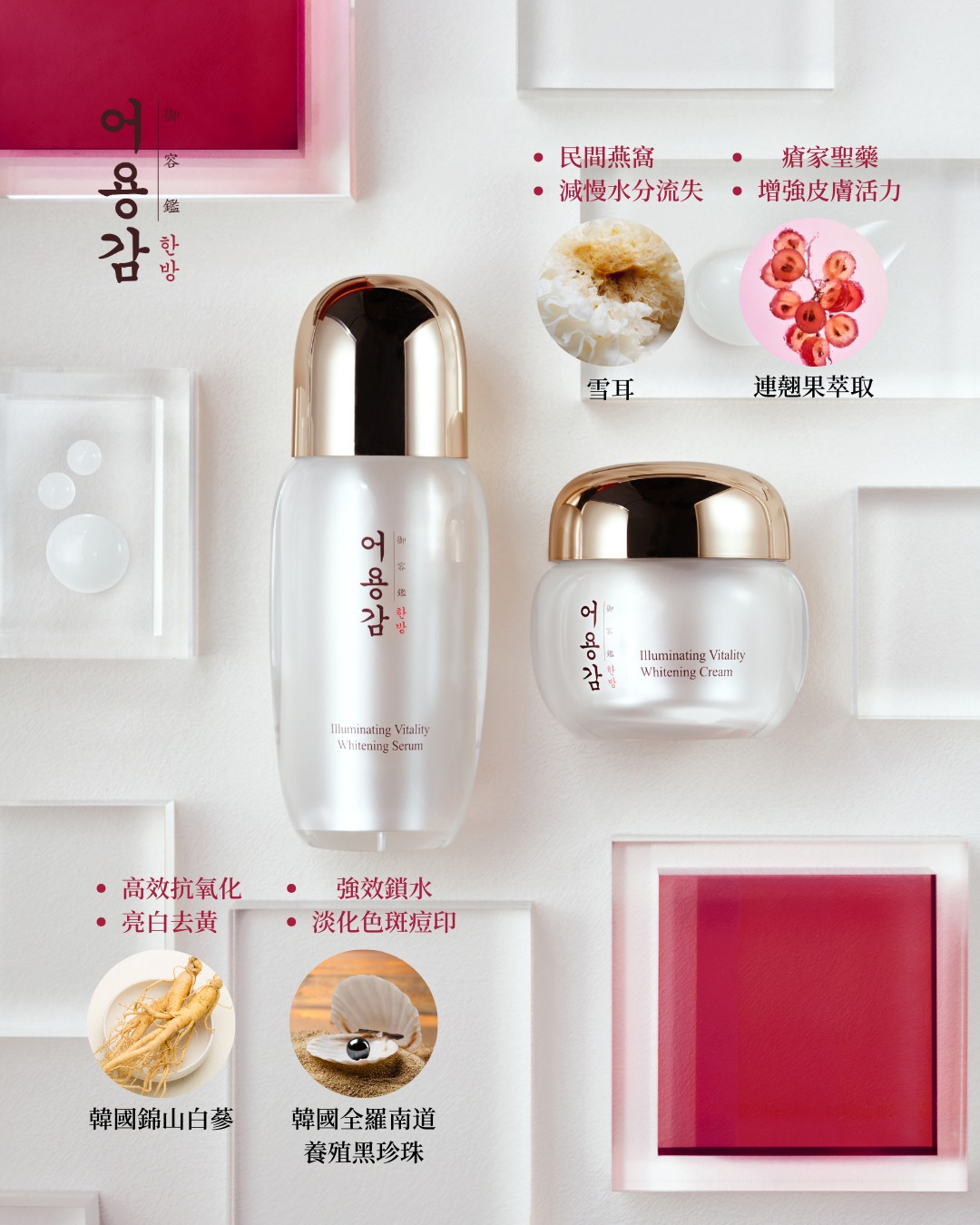 •蘊含白玉散: 內含3%韓國錦山白蔘、韓國全羅南道養殖黑珍珠、1%雪耳、連翹果萃取及芍藥。
