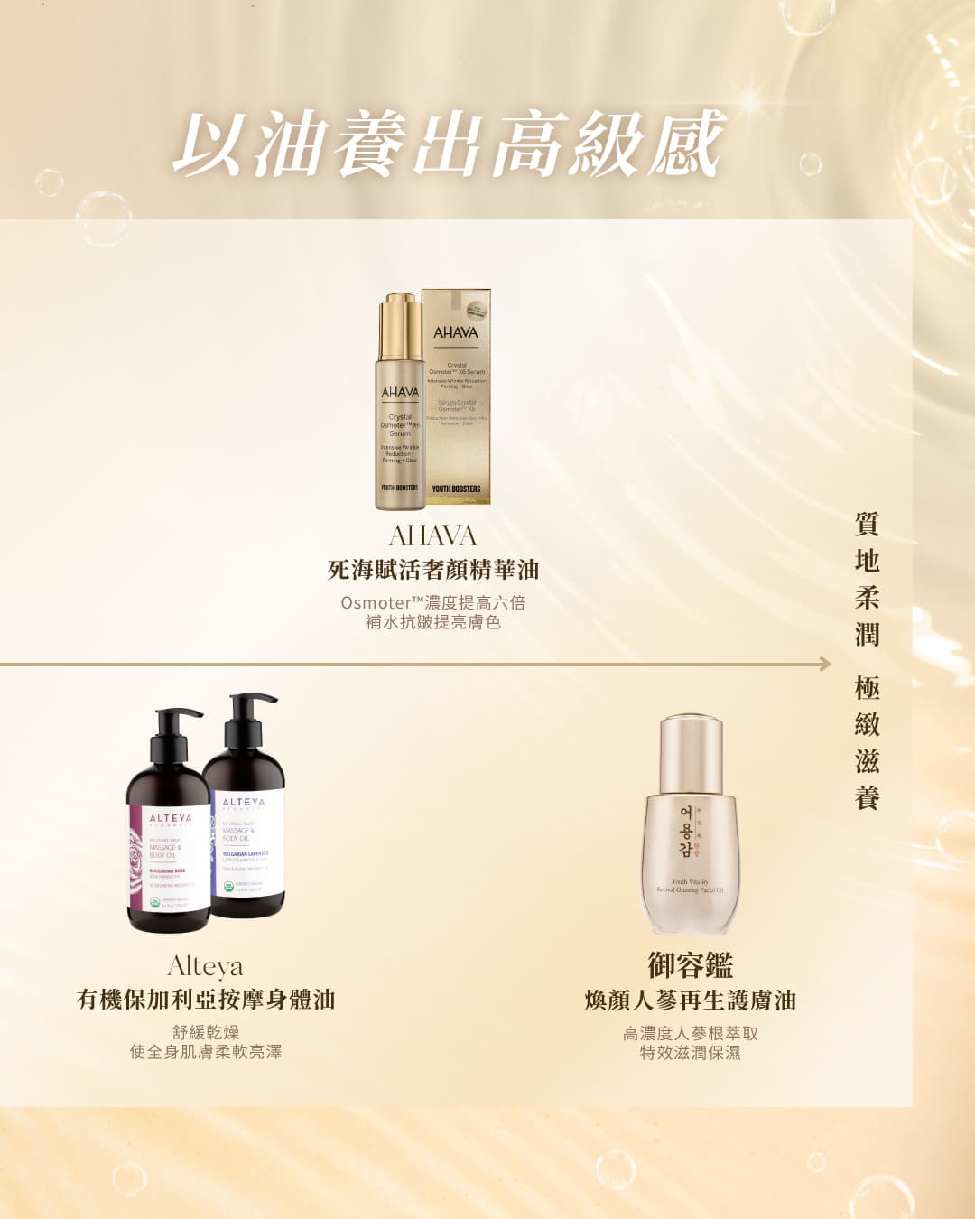 •加入6種植物油發酵混合物: 摩洛哥堅果仁,荷荷巴籽, 山茶籽,綠茶籽,昆士蘭堅果及橄欖油,特效滋潤及保濕鎖水,具抗氧化功效,令肌膚更光澤細緻。