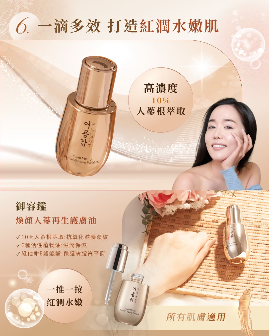 蘊含高濃度10%人蔘根萃取,有效增強肌膚彈性,只需1滴即可豐盈滋養,固養活氣,重塑緊緻嫩滑肌膚。