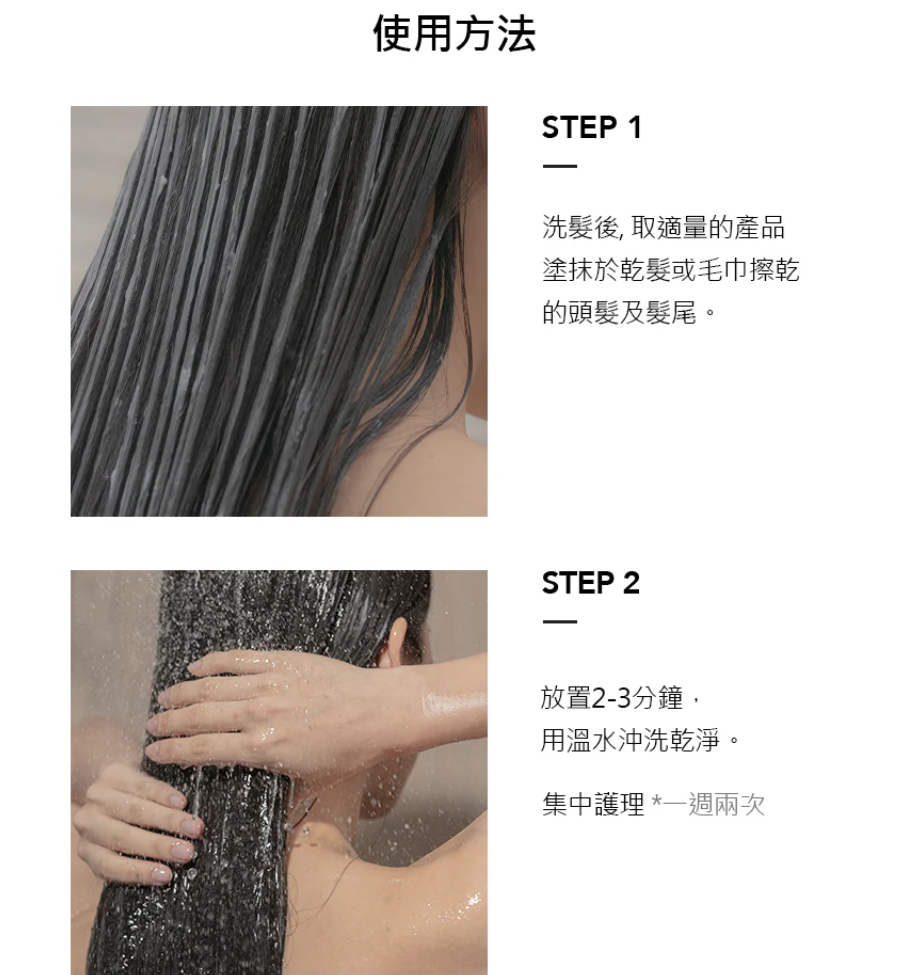 取適量的產品塗抹於乾髮或毛巾擦乾的頭髮及髮尾。並自然放置5-10分鐘,然後徹底沖洗。