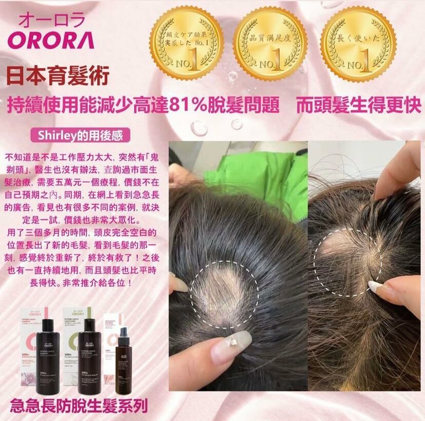 使用整套急急長的系列 - 洗髮水、護髮素、髮膜和噴霧,能減少高達 81% 的脫髮